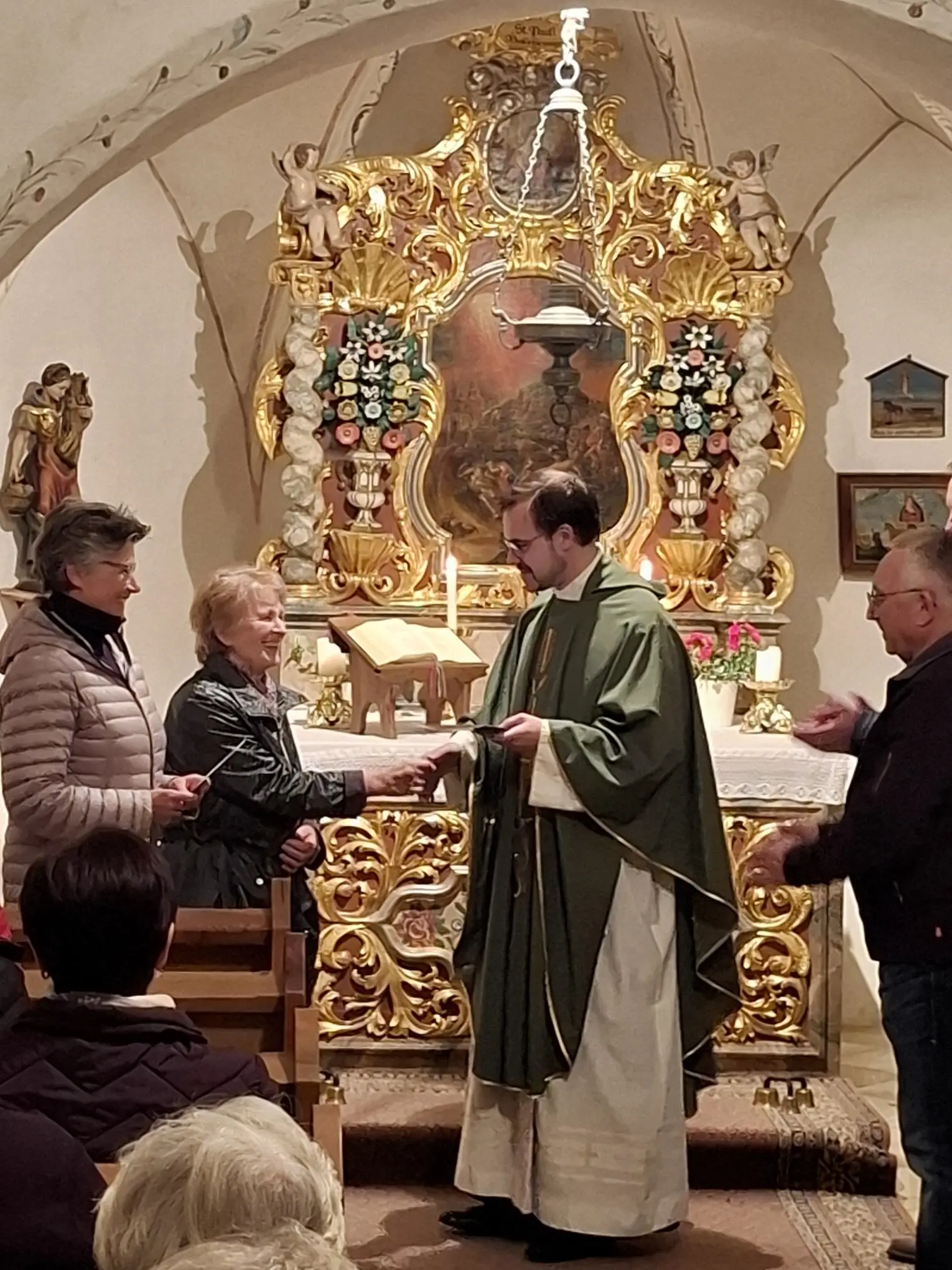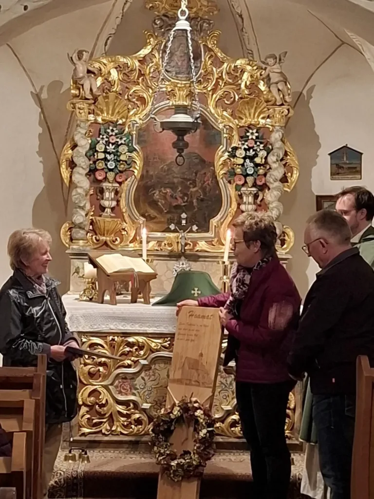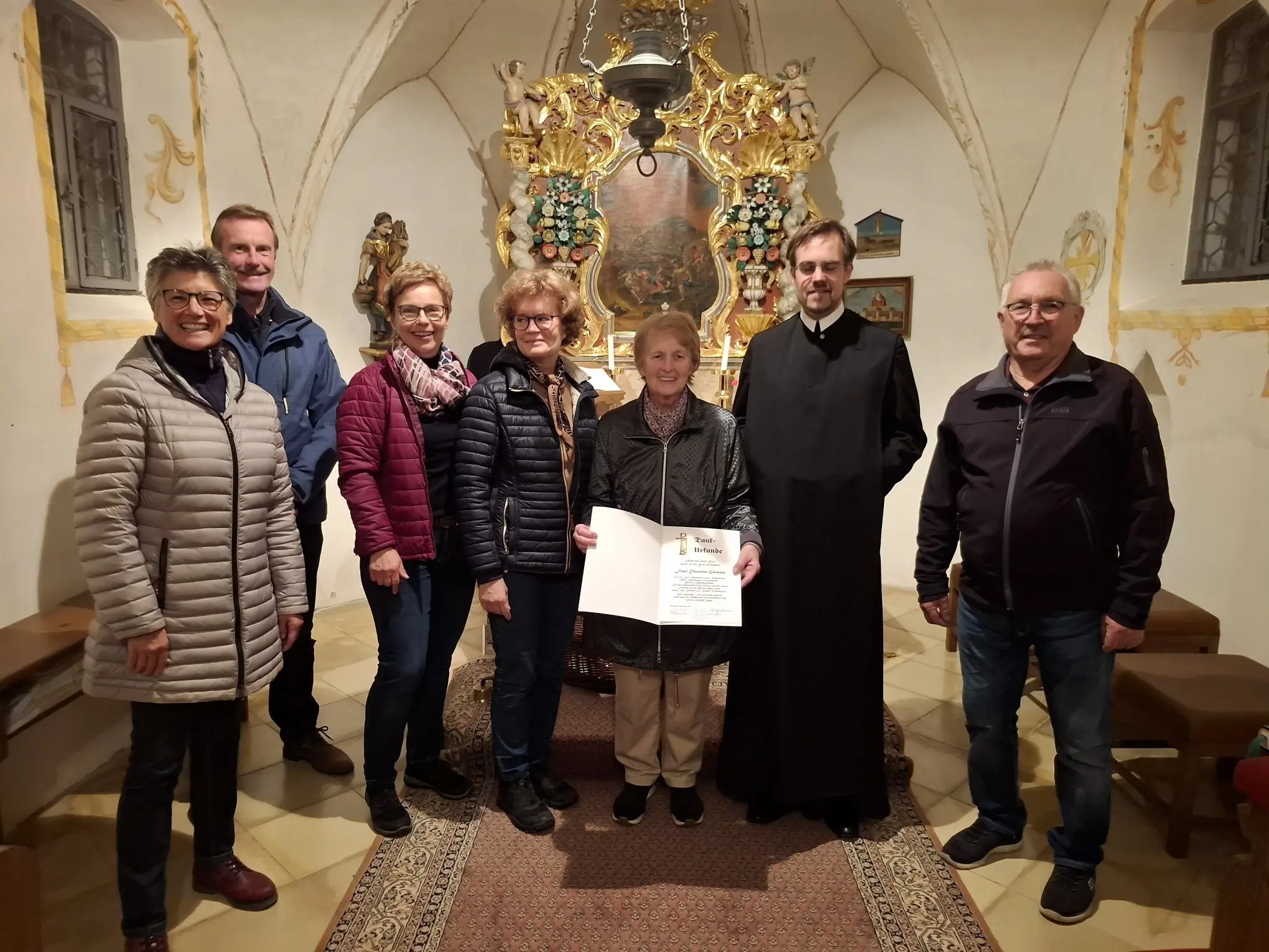 Stephansposching. Nach über 22 Jahren eifriger und unermüdlicher Tätigkeit als Mesnerin der Nebenkirche in Rottenmann, hat Frau Lore Gürster dieses Amt in jüngere Hände weitergegeben. Beim Gottesdienst in der übervollen Kirche am Donnerstag, den 22. Oktober, überreichte Pfarrer Pater Gregor Schuller OSB neben einer von Bischof Rudolf Voderholzer unterzeichneten Dankurkunde ein Abschiedsgeschenk vonseiten der Pfarrei Stephansposching. Einige Sängerinnen des Frauenchors Stephansposching gestalteten die Messe musikalisch mit. Und auch die Dorfbevölkerung von Rottenmann ließ es sich nicht nehmen, „ihrer“ Mesnerin mit einem Präsent einen von herzen kommenden Dank und große Anerkennung für ihren Dienst auszusprechen. Jung und Alt ließen die Feier bei einem gemütlichen Beisammensein im Anschluss an den Gottesdienst ausklingen. Ein herzlicher Dank gebührt Frau Birgid Ertl und Frau Martha Limbrunner, die fortan den Mesnerdienst gemeinsam besorgen!