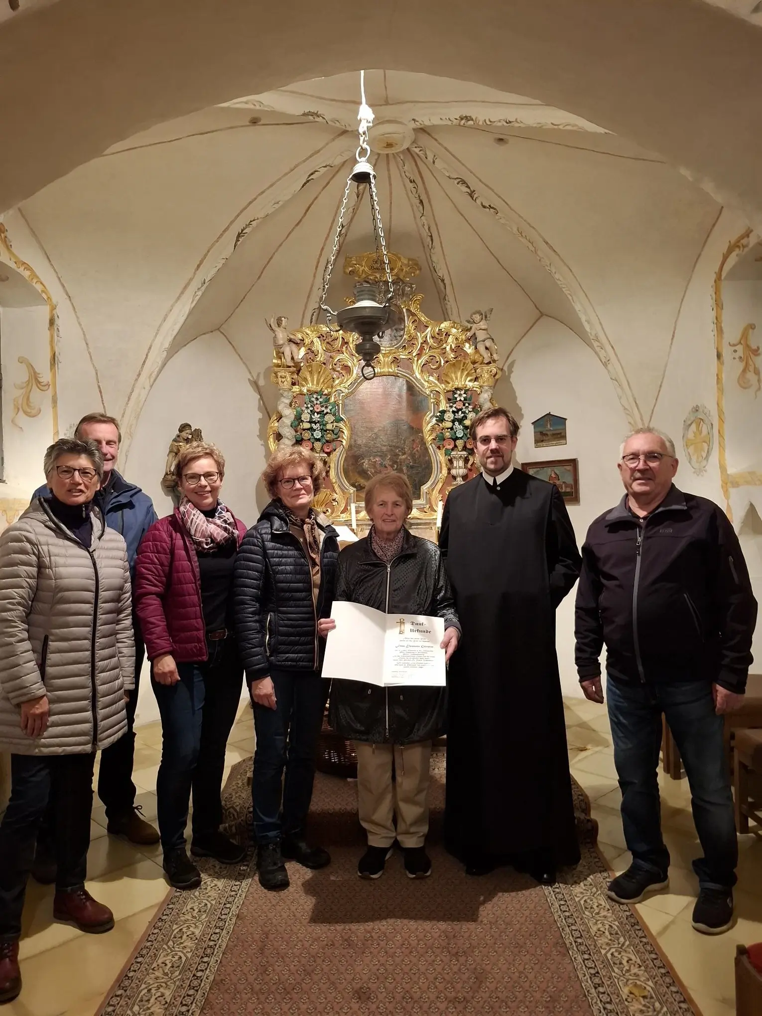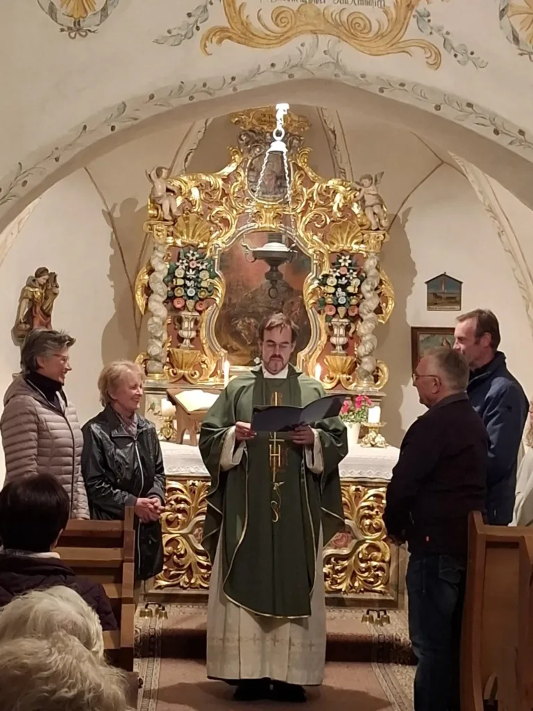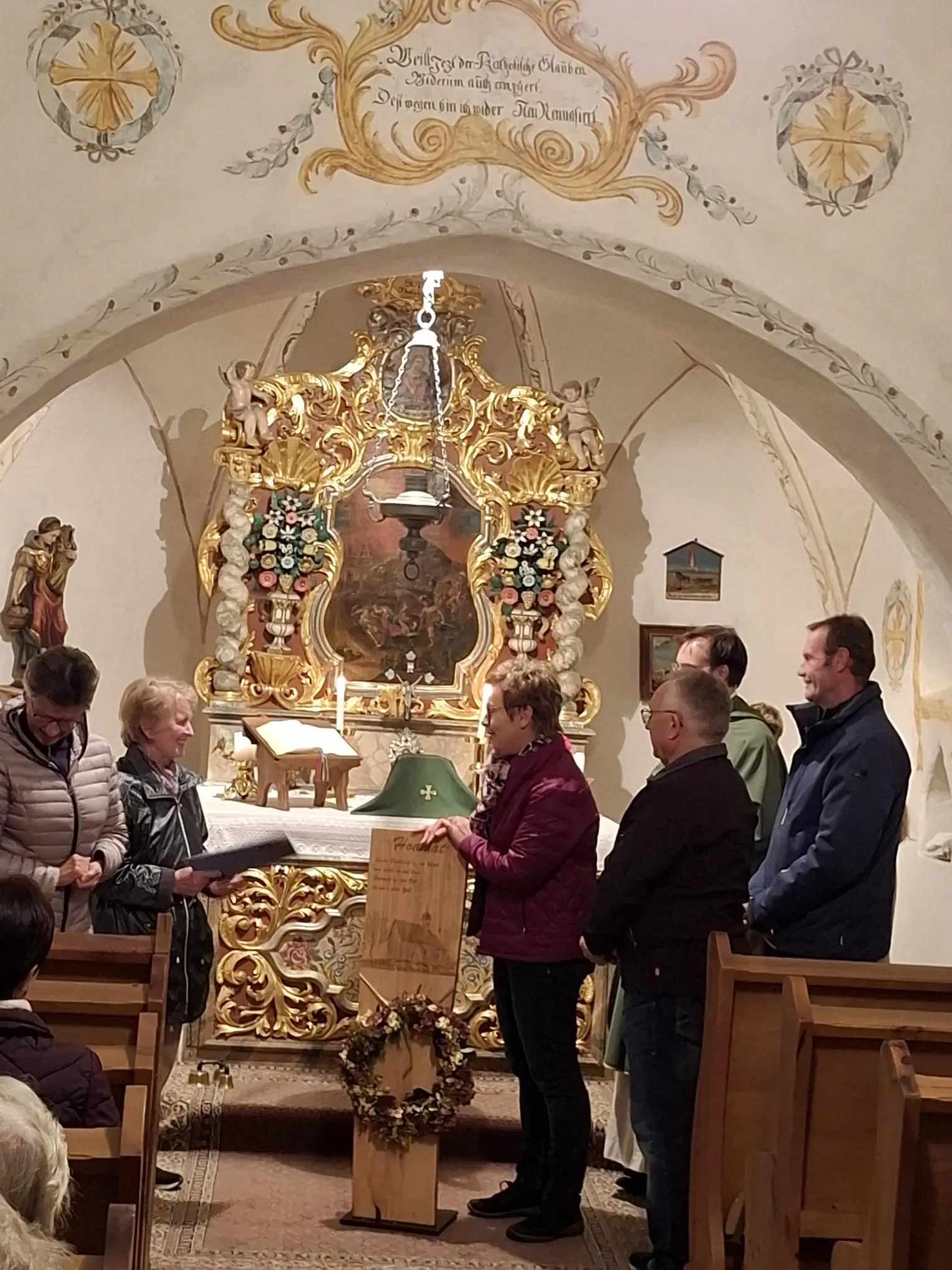 Stephansposching. Nach über 22 Jahren eifriger und unermüdlicher Tätigkeit als Mesnerin der Nebenkirche in Rottenmann, hat Frau Lore Gürster dieses Amt in jüngere Hände weitergegeben. Beim Gottesdienst in der übervollen Kirche am Donnerstag, den 22. Oktober, überreichte Pfarrer Pater Gregor Schuller OSB neben einer von Bischof Rudolf Voderholzer unterzeichneten Dankurkunde ein Abschiedsgeschenk vonseiten der Pfarrei Stephansposching. Einige Sängerinnen des Frauenchors Stephansposching gestalteten die Messe musikalisch mit. Und auch die Dorfbevölkerung von Rottenmann ließ es sich nicht nehmen, „ihrer“ Mesnerin mit einem Präsent einen von herzen kommenden Dank und große Anerkennung für ihren Dienst auszusprechen. Jung und Alt ließen die Feier bei einem gemütlichen Beisammensein im Anschluss an den Gottesdienst ausklingen. Ein herzlicher Dank gebührt Frau Birgid Ertl und Frau Martha Limbrunner, die fortan den Mesnerdienst gemeinsam besorgen!